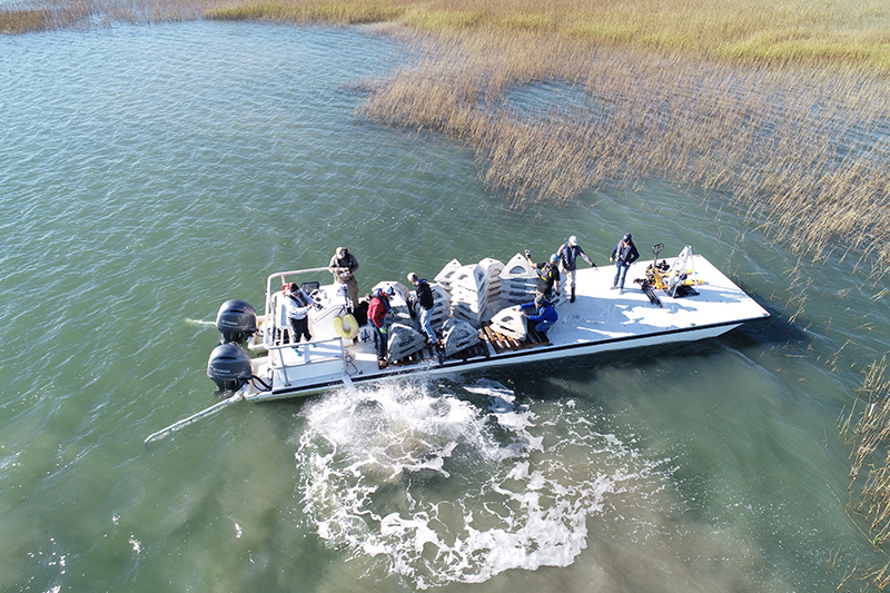 Volunteers from Coastal Conservation Association (CCA) Georgia assisted in the Dec. 12 deployment, helping to load the 100-pound concrete pyramids onto a 40-foot pontoon boat and placing them in the water at Romerly Marsh Creek. The concrete pyramids were molded and donated by Smyrna Ready Mix Concrete (SRM), a family-owned ready-mix, aggregates and cement company, at no cost to CRD or the State of Georgia using leftover concrete.